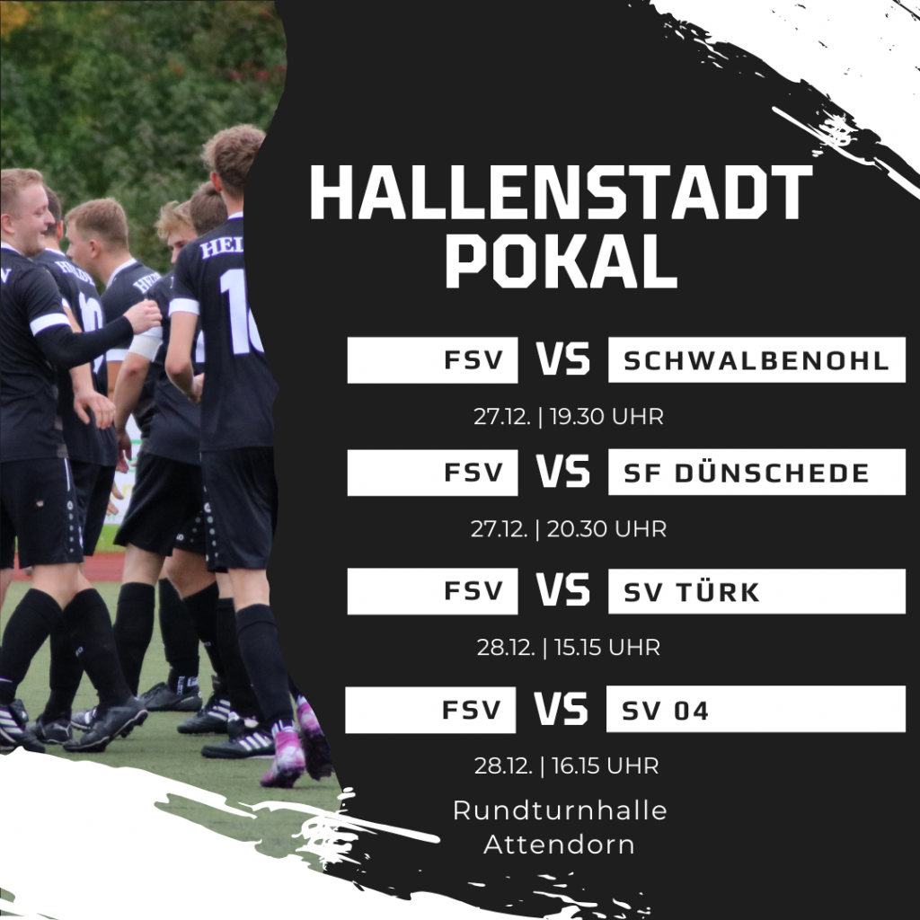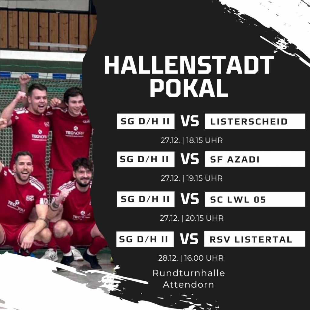 Unsere Erste trifft in der Vorrunde auf den FC Attendorn-Schwalbenohl, unsere Nachbarn aus Dünschede, den SV 04 Attendorn und den SV Türk Attendorn. Die Zweite muss sich gegen den SC LWL 05, die SF Azadi Attendorn, den RSV Listertal und den SV Listerscheid behaupten. Neben den Senioren sind auch die Junioren im Einsatz. Am Samstag spielt die B-Jugend ihren Hallenstadtpokalsieger aus, am Sonntag folgt das Turnier der A-Junioren.