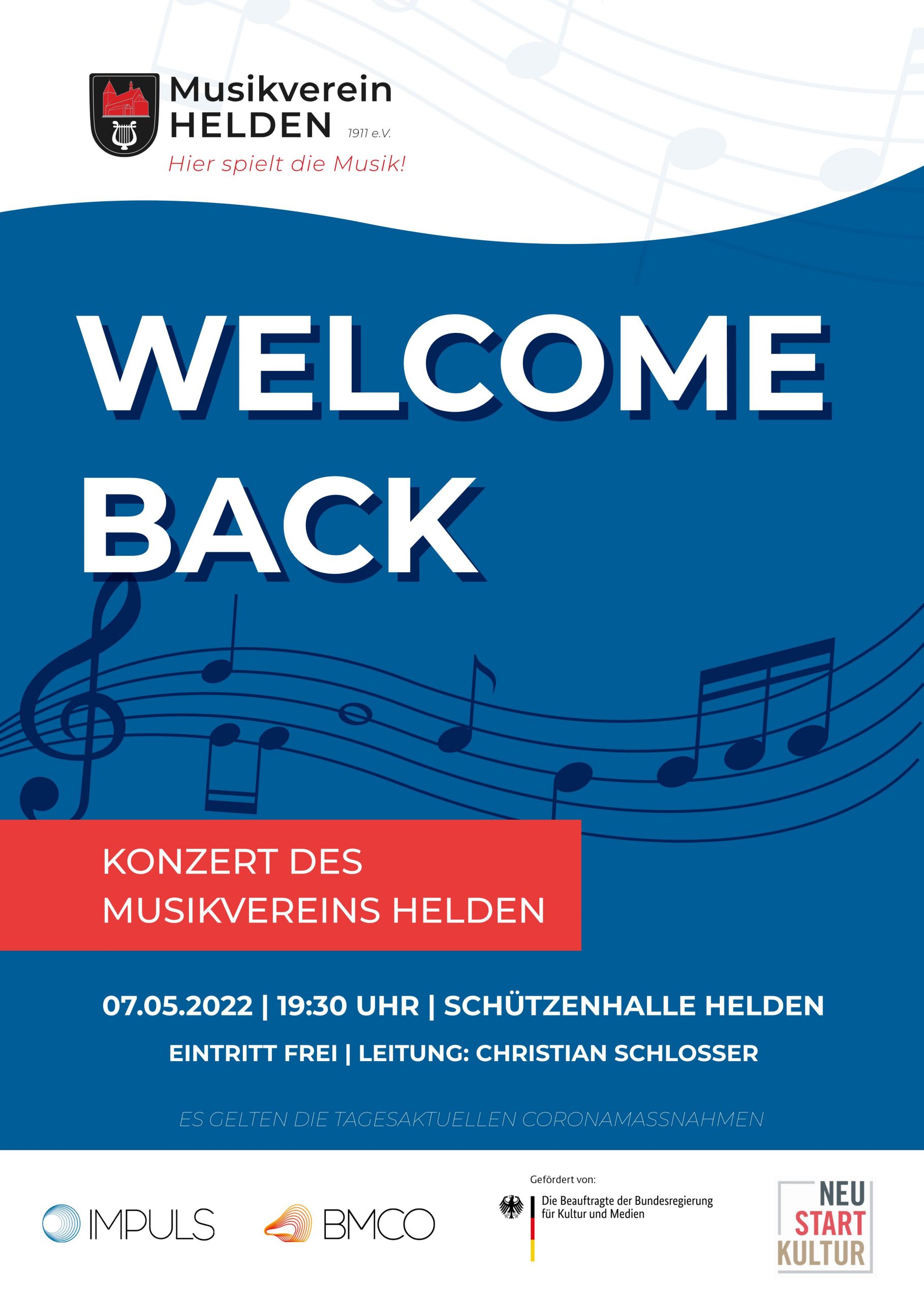 Der Musikverein Helden lädt am 7. Mai zum "Welcome Back"-Konzert ein! "WELCOME BACK! Endlich ist es wieder soweit und wir dürfen Euch ein abwechslungsreiches Konzertprogramm präsentieren.  Von klassischen Armee-Märschen über Medleys bis hin zu Konzertmärschen, Filmmusik und Polka - in unserem diesjährigen Programm haben wir alles vereint, was zur Vorbereitung auf die kommende Schützenfestsaison benötigt wird. Wir freuen uns Euch am 07.05.2022 um 19:30 Uhr in der Schützenhalle Helden begrüßen zu dürfen! Der Eintritt ist wie immer frei....
