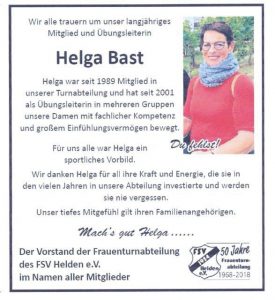 Der FSV Helden und die Frauenturnabteilung trauern um die langjährige Übungsleiterin Helga Bast. Das tiefe Mitgefühl gilt ihren Angehörigen.